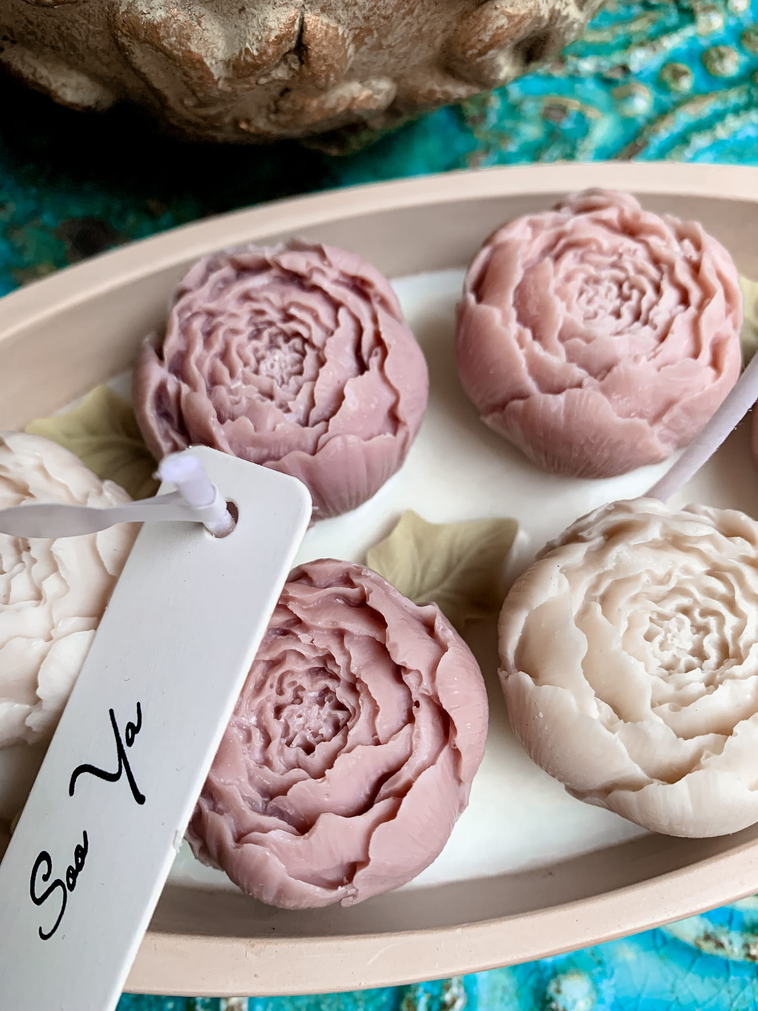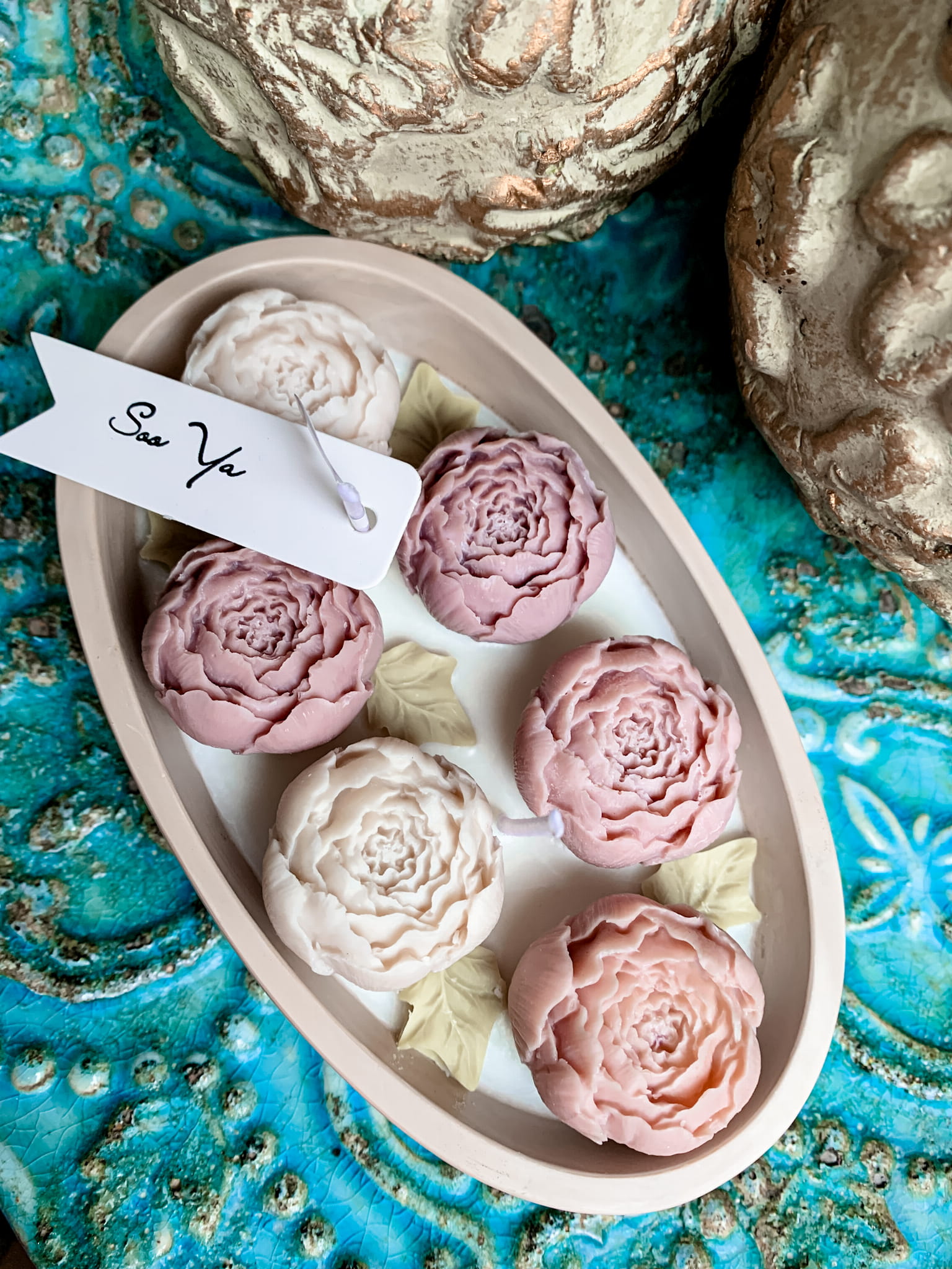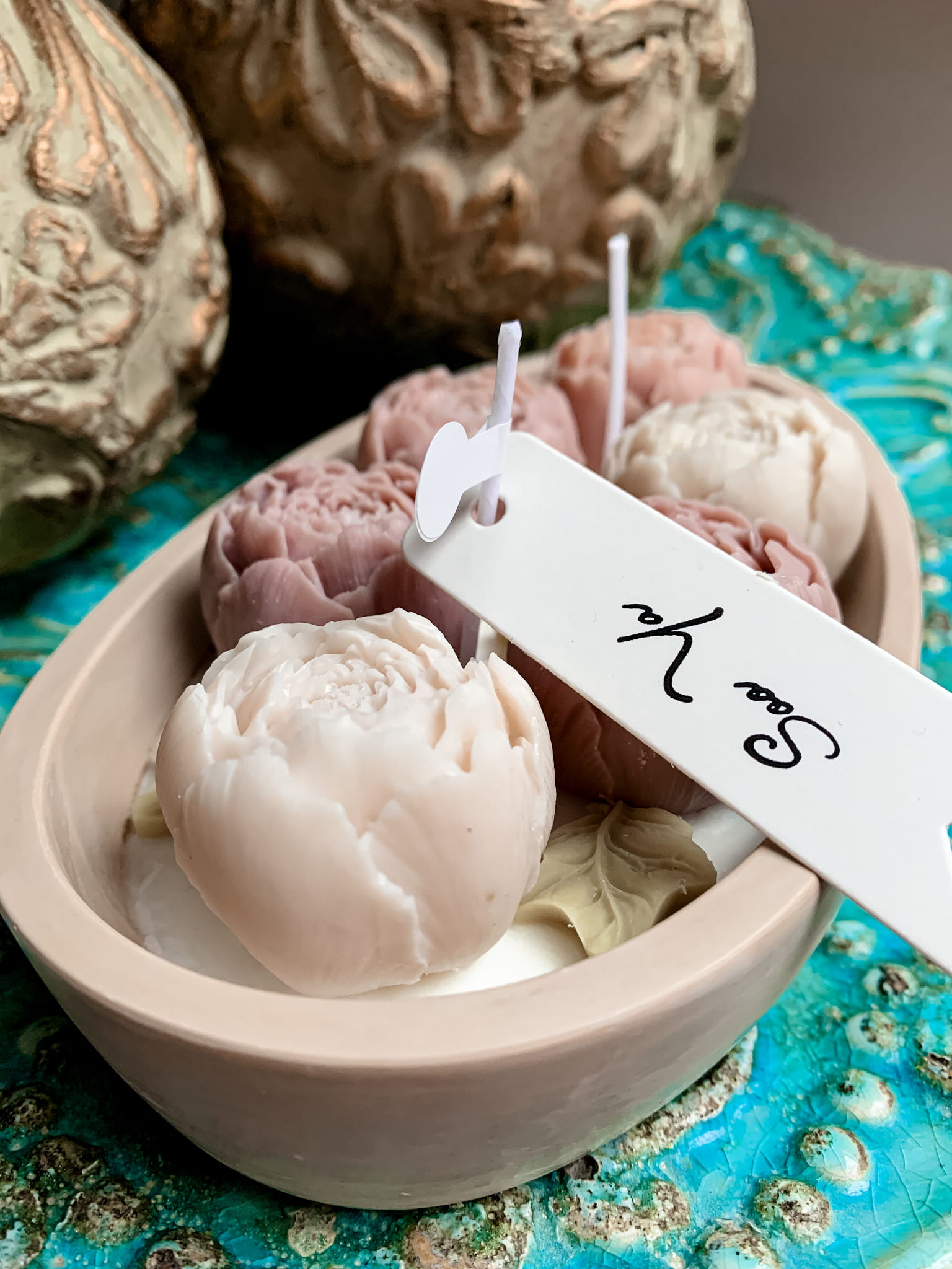Unikatowa świeca dekoracyjna w kształcie pełnych piwonii w delikatnych, pudrowych kolorach.