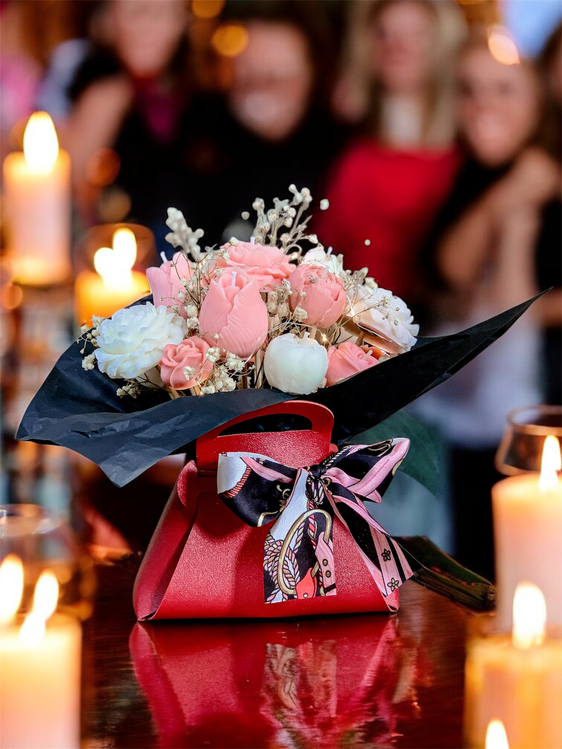 Flower Box ze Świecami Sojowymi – Pudrowy Róż w eleganckiej czerwonej torebce