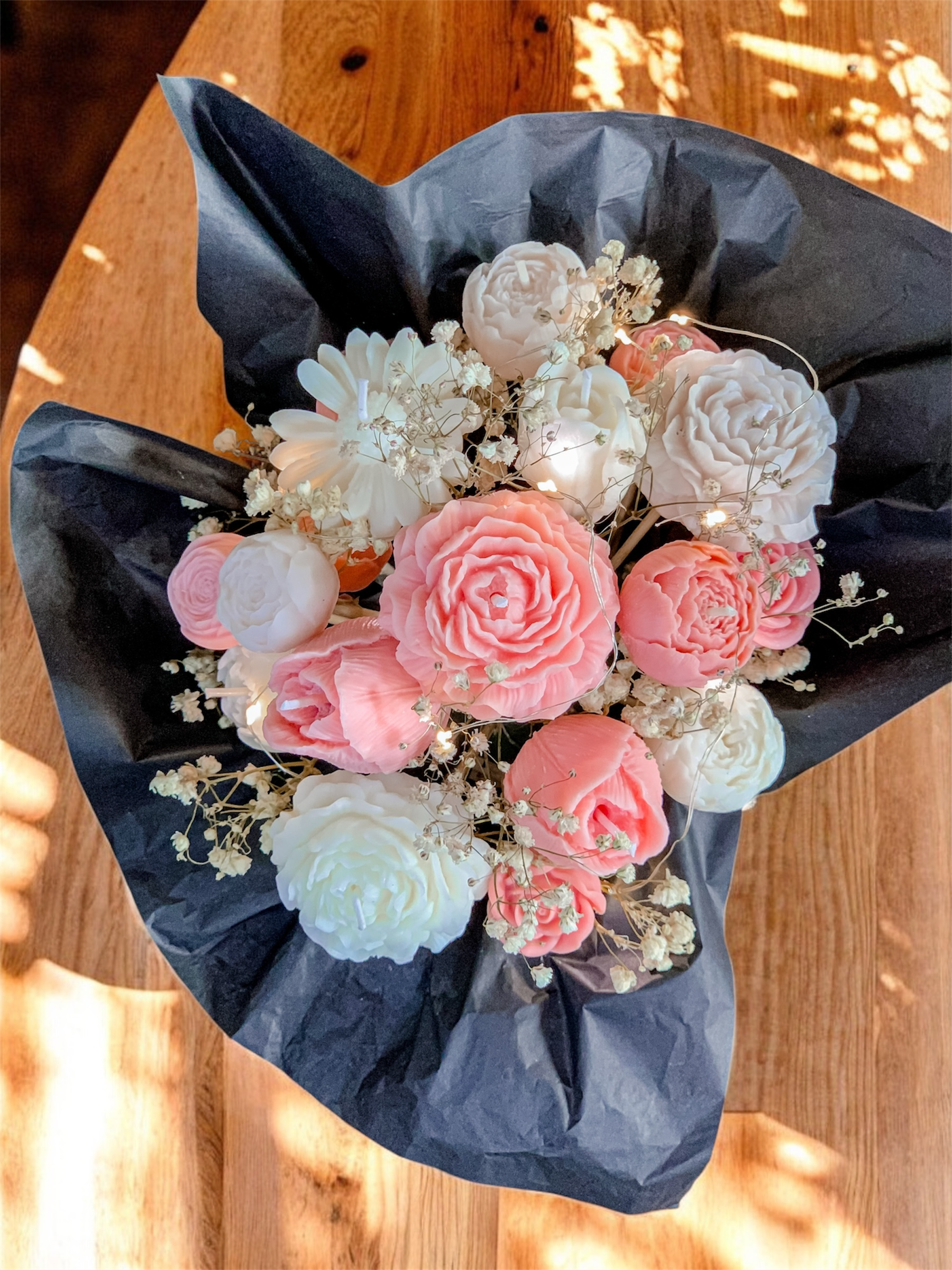 - Sprawdź skład zestawu Zestaw zawiera: świeczki w kształcie kwiatków na patyczkach, dekoracyjny pojemnik w kształcie torebki ozdobiony papierem bibułowym, suszone kwiatki jako dekorację oraz lampki LED na baterię (osobna dekoracja).