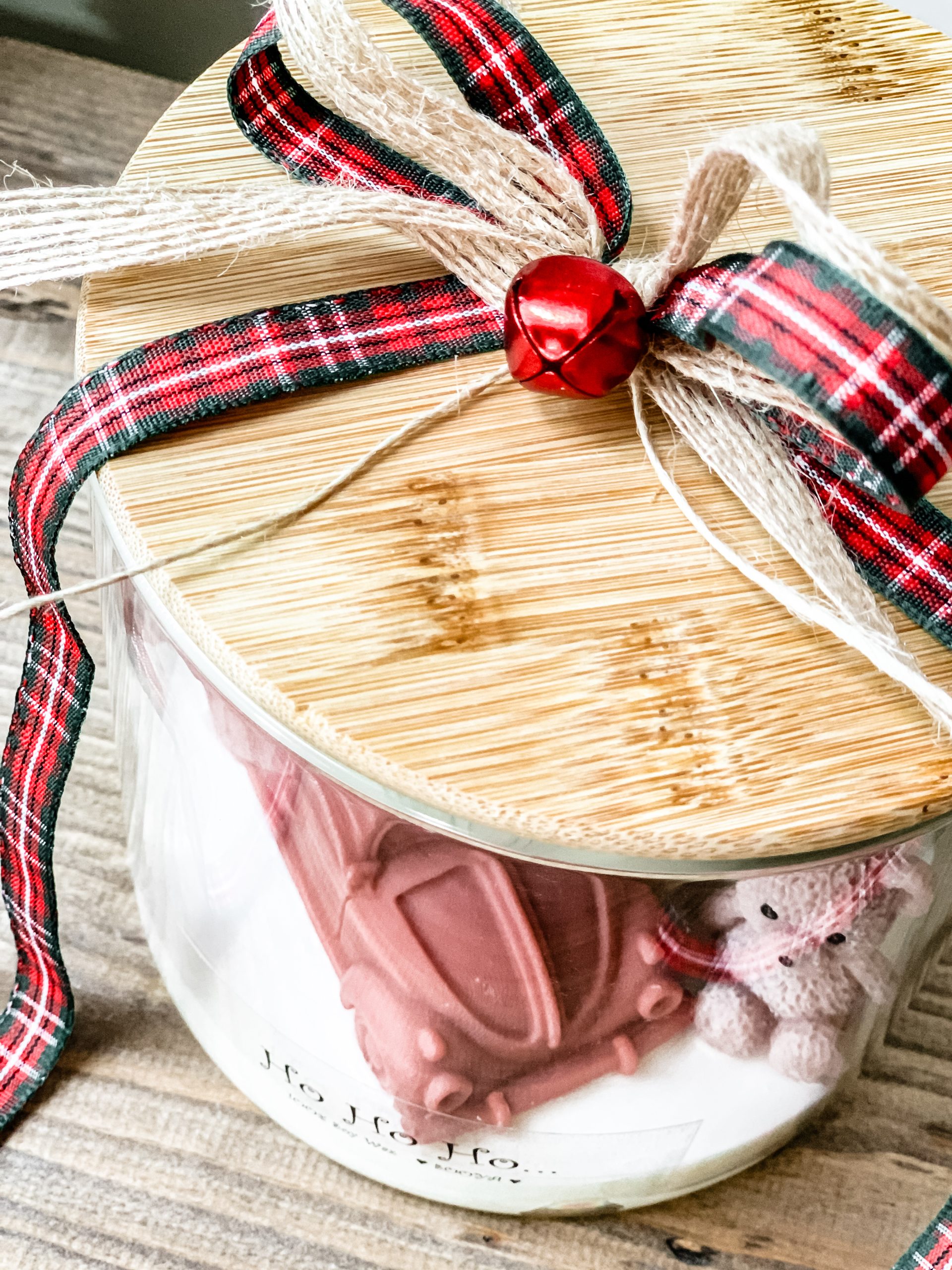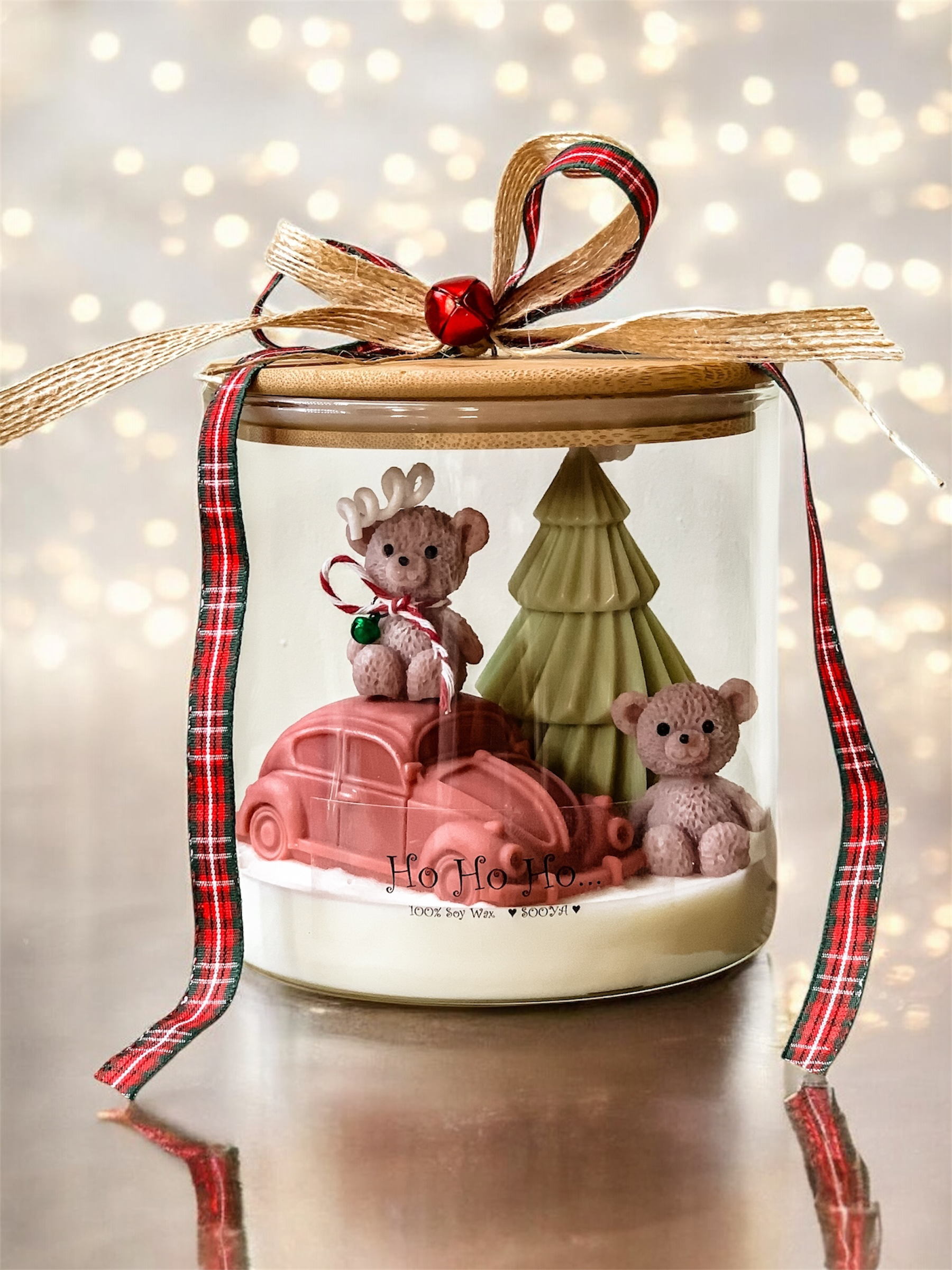 Nasza duża świeca HoHoHo to coś więcej niż źródło światła – to rzemieślnicza dekoracja, którą stworzyliśmy z myślą o osobach szukających nietuzinkowych akcentów bożonarodzeniowych. Wewnątrz solidnego, szklanego naczynia zamknęliśmy urokliwą zimową scenerię. Znajdziesz tam ręcznie odlane z wosku detale: kultowego garbusa, choinkę oraz dwa małe misie. Całość dopełnia szklana pokrywka z elegancką, ręcznie wiązaną kokardką.