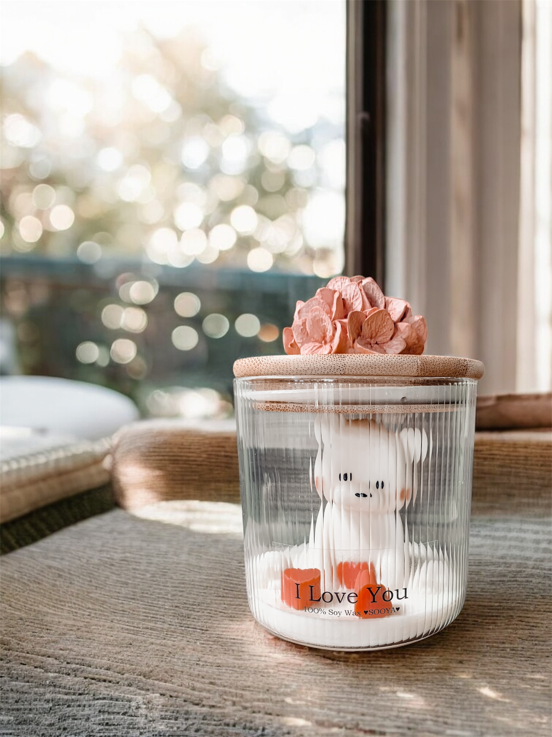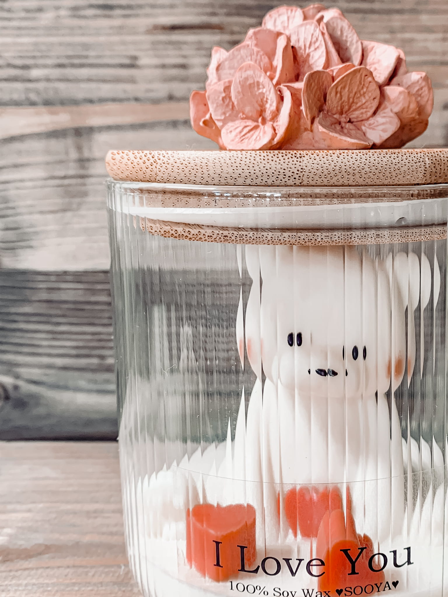 Odkryj połączenie subtelności i rzemieślniczej pasji. Świeca sojowa z misiem to wyjątkowy projekt w ryflowanym szkle, w którym umieściliśmy precyzyjnie wykonaną figurkę z wosku sojowego. Całość dopełnia bambusowa pokrywka zdobiona gipsowym odlewem hortensji. Ta bezzapachowa świeca z misiem to idealny wybór na luksusowy prezent, który po wypaleniu wosku pozwoli Ci wykorzystać eleganckie naczynie jako stylowy pojemnik na drobiazgi.