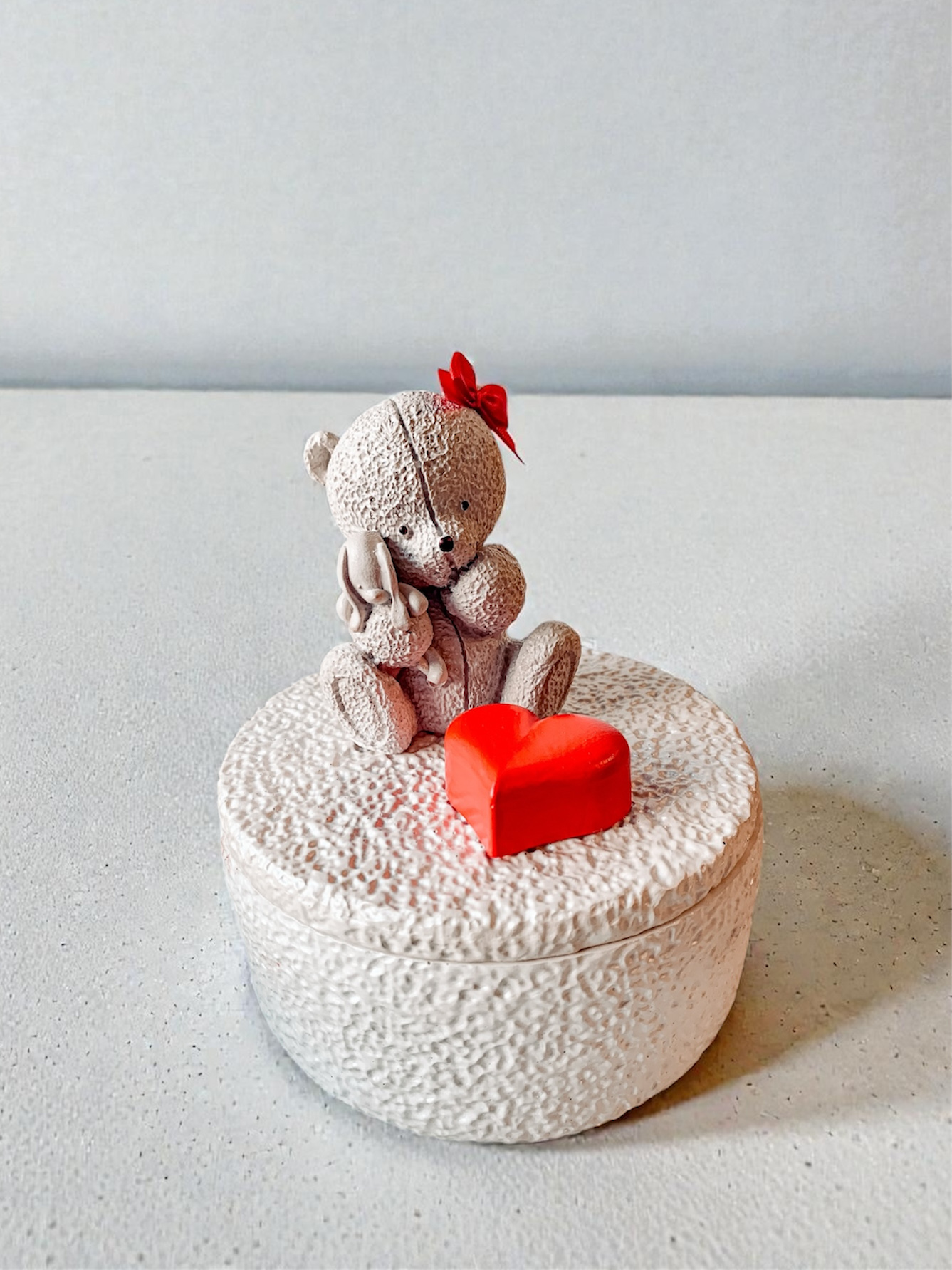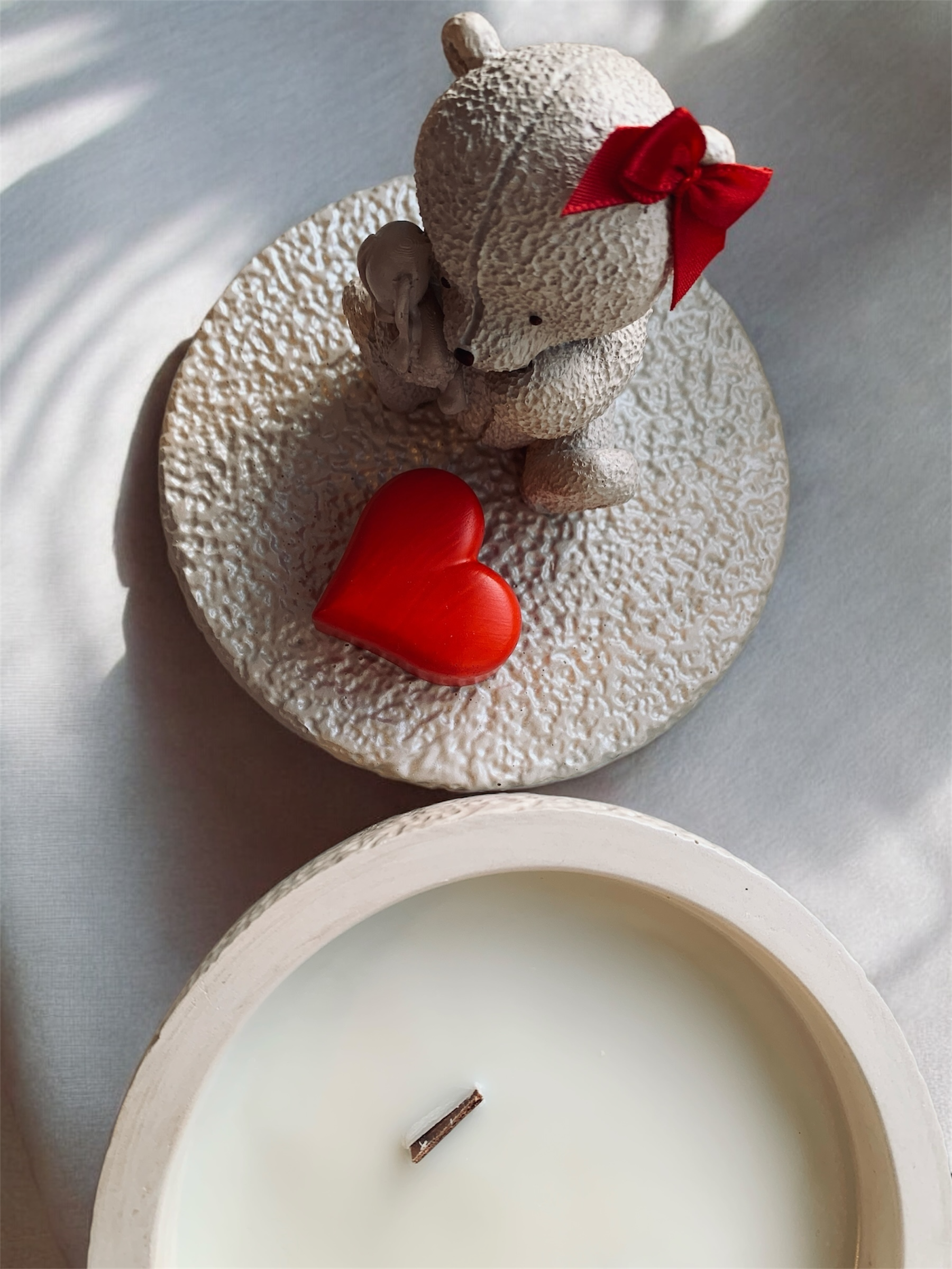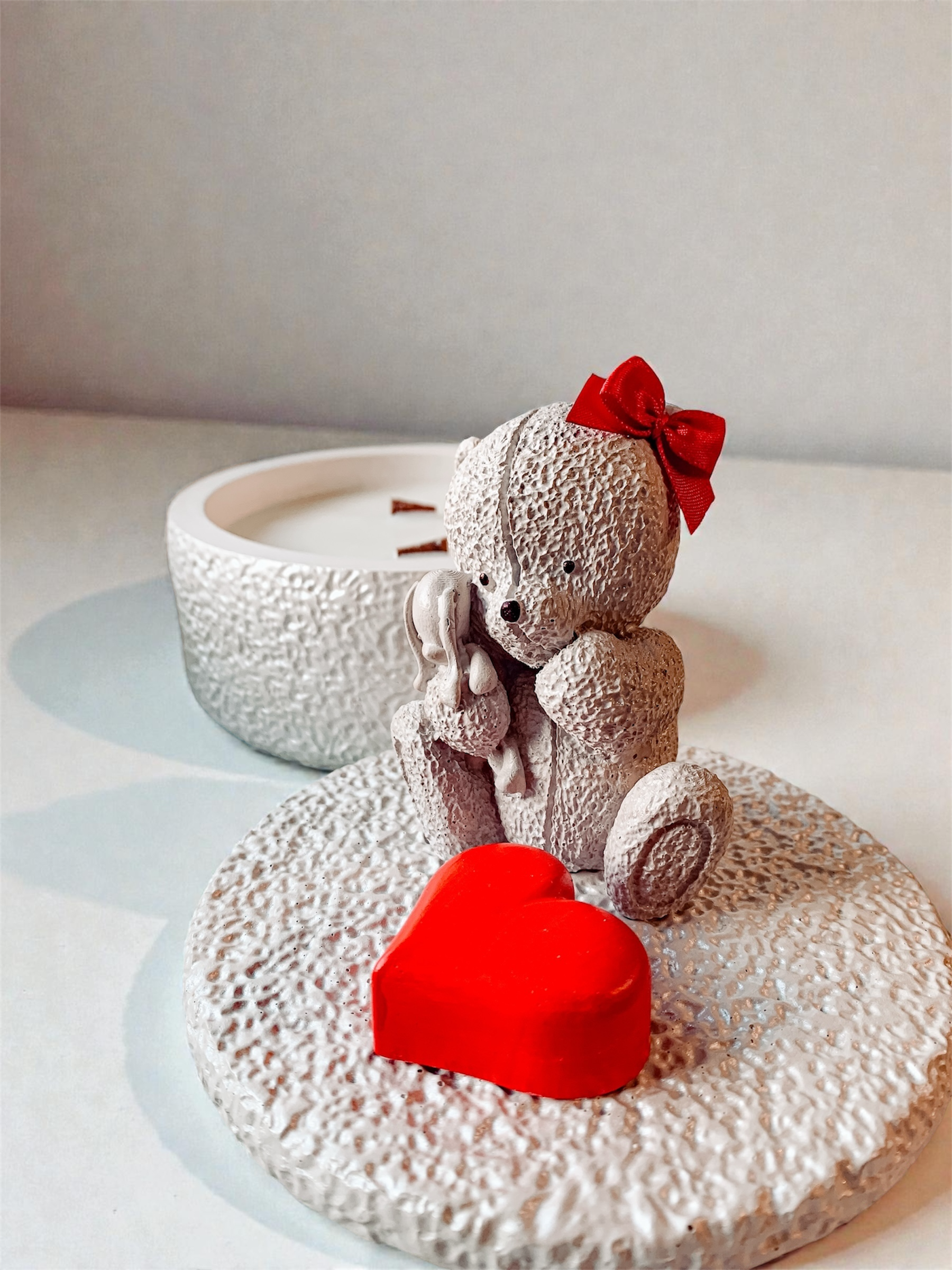Urocza świeca sojowa w kształcie misia z sercem. Wykonana ręcznie z naturalnego wosku, bez dodatku sztucznych aromatów i barwników. Dzięki swojej subtelnej formie idealnie sprawdza się jako podziękowanie dla gości na Chrzest, Komunię lub Baby Shower, a także jako minimalistyczna dekoracja do pokoju dziecięcego.