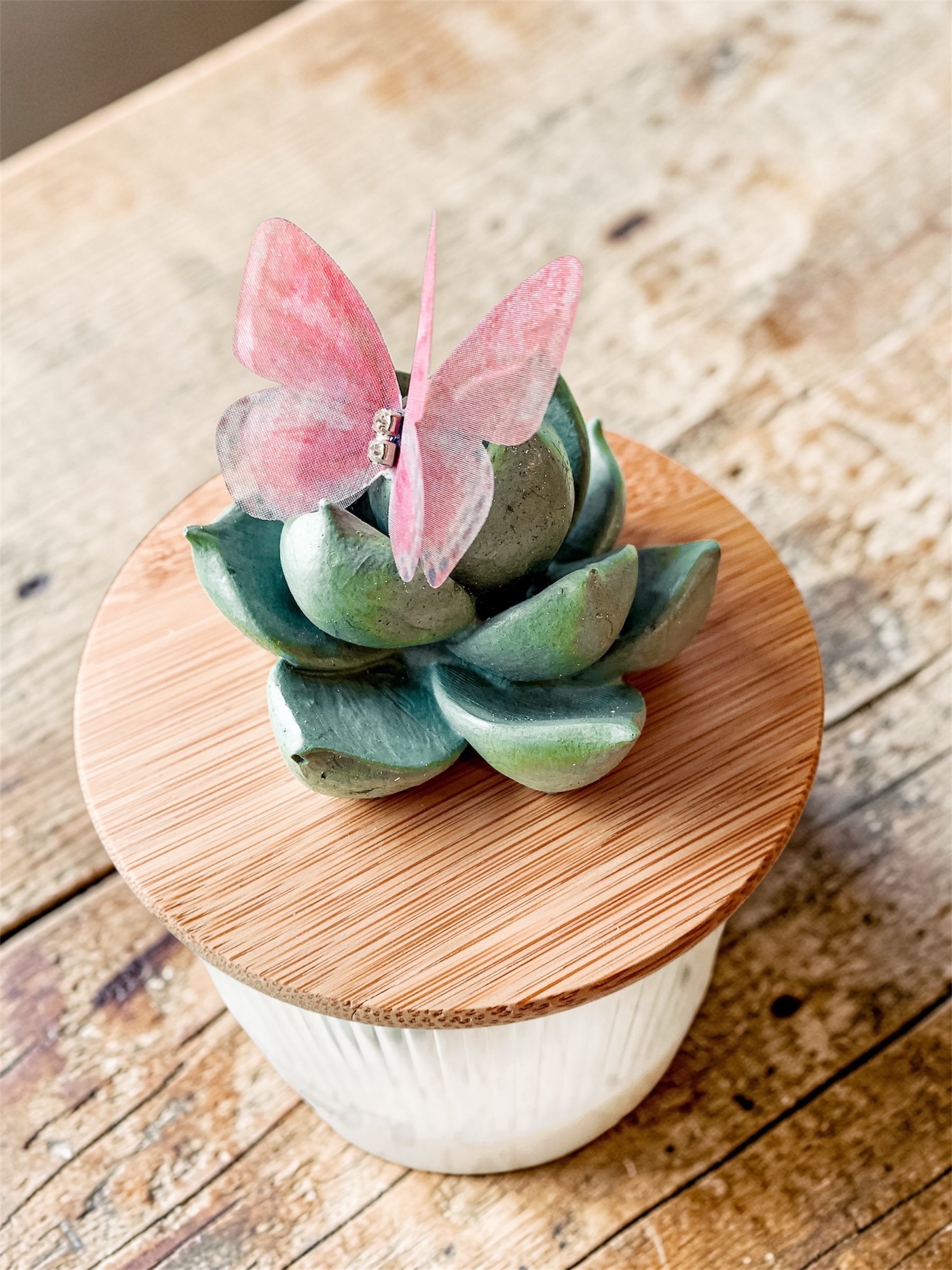 Detale, które cieszą oko: Bambusowa pokrywka to nie tylko eko-dodatek – to zwieńczenie całości z uroczą figurką kaktusa i różowym motylkiem. To ten rodzaj dekoracji, który Twoje przyjaciółki będą oglądać z bliska przy każdej kawie.
