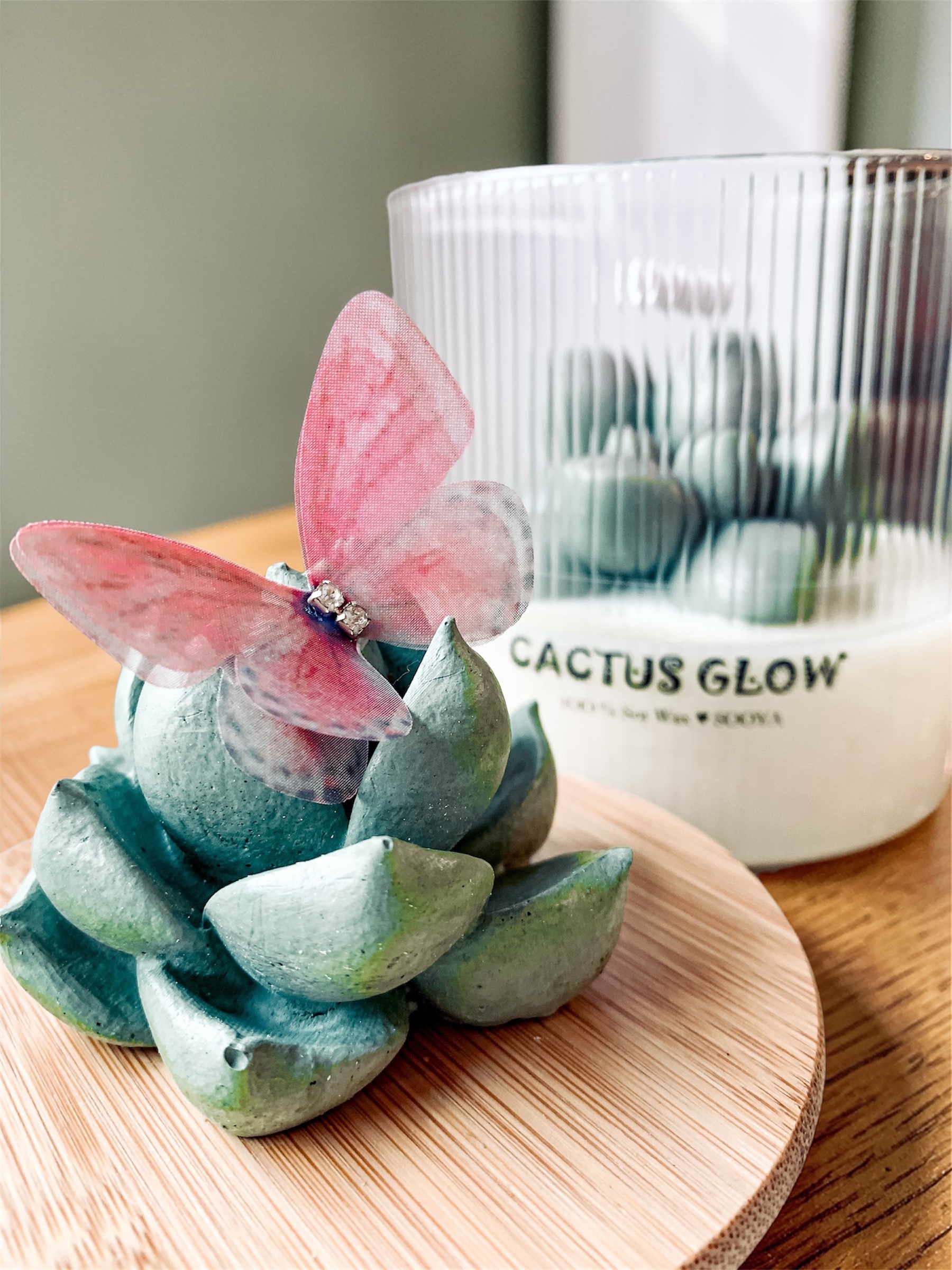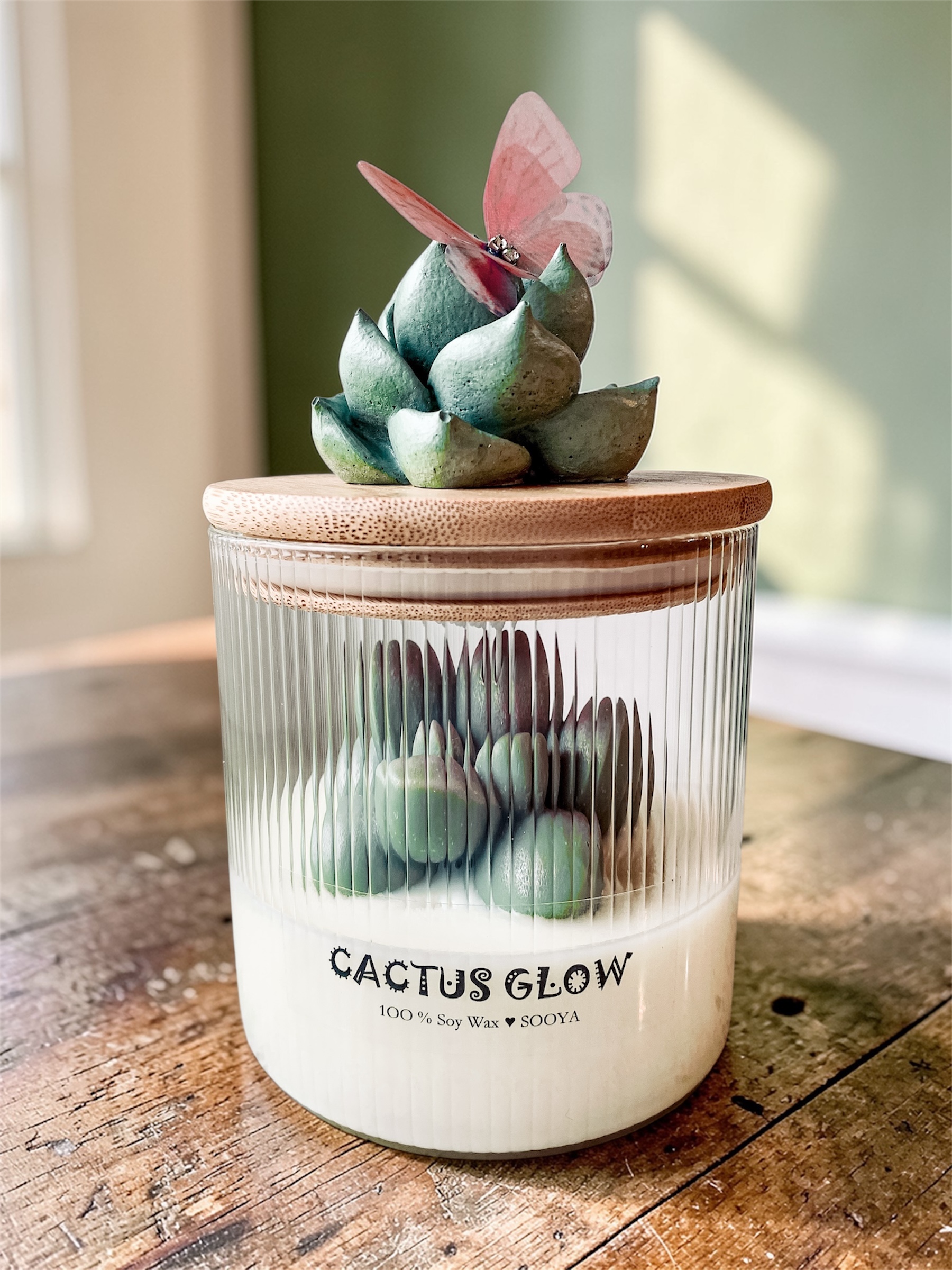 Świeca sojowa – Zielony Kaktus w szklanym pojemniku z dekoracyjnym motylkiem