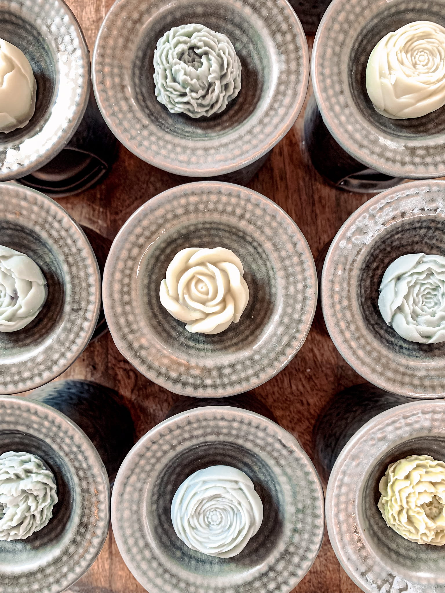 Bezzapachowa świeca sojowa z dekoracyjnym kwiatem w kolorze szarym – stylowy dodatek do wnętrz