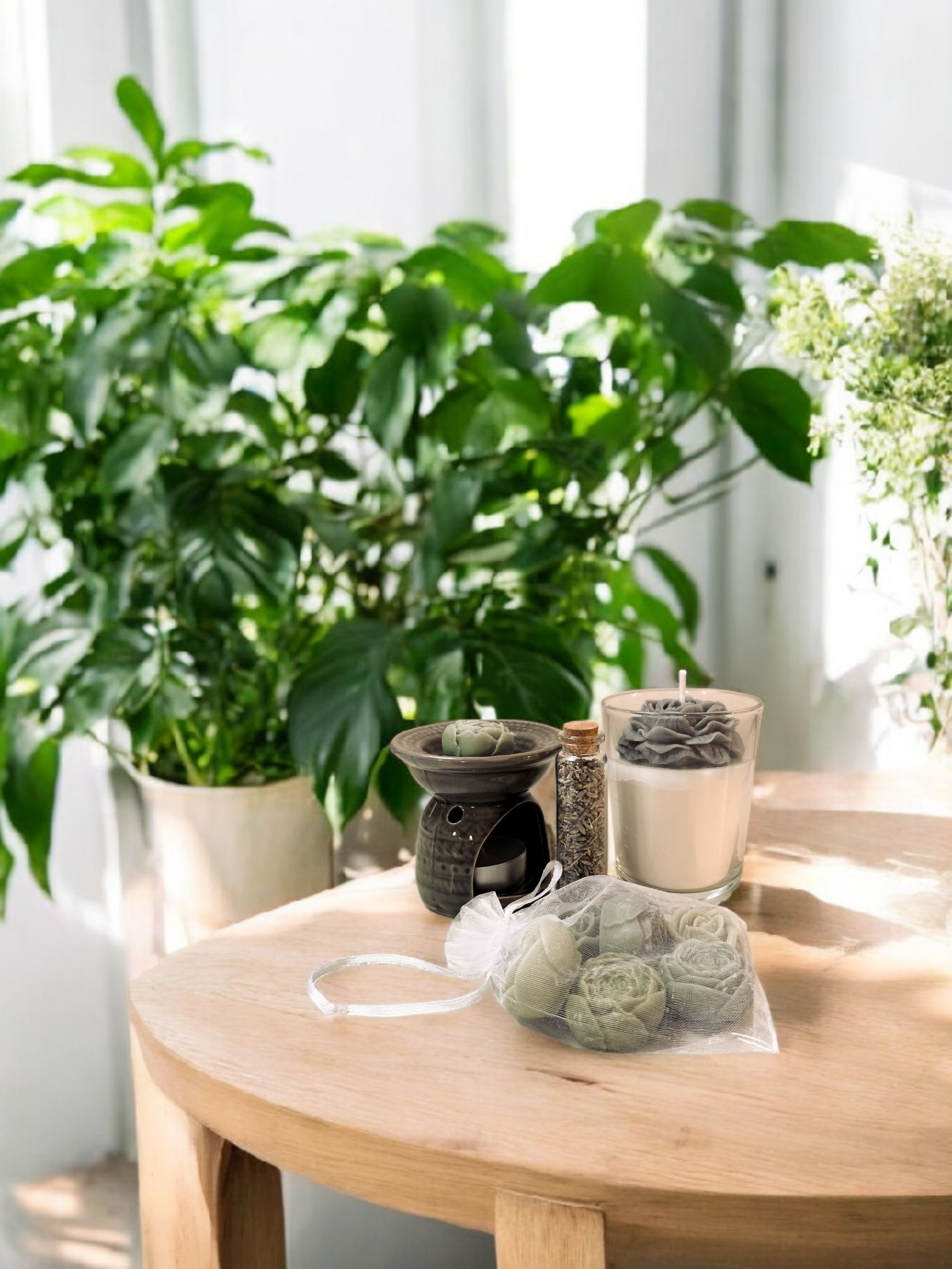 Zestaw ze świecą sojową, kominkiem i lawendą Szara Elegancja to połączenie prostoty, elegancji i natury, które wprowadzi wyjątkowy nastrój do Twojego domu. W skład zestawu wchodzi świeca sojowa, kominek, woski bezzapachowe oraz suszoną lawendę, które razem stworzą przyjemną, wyciszającą atmosferę w każdym pomieszczeniu.