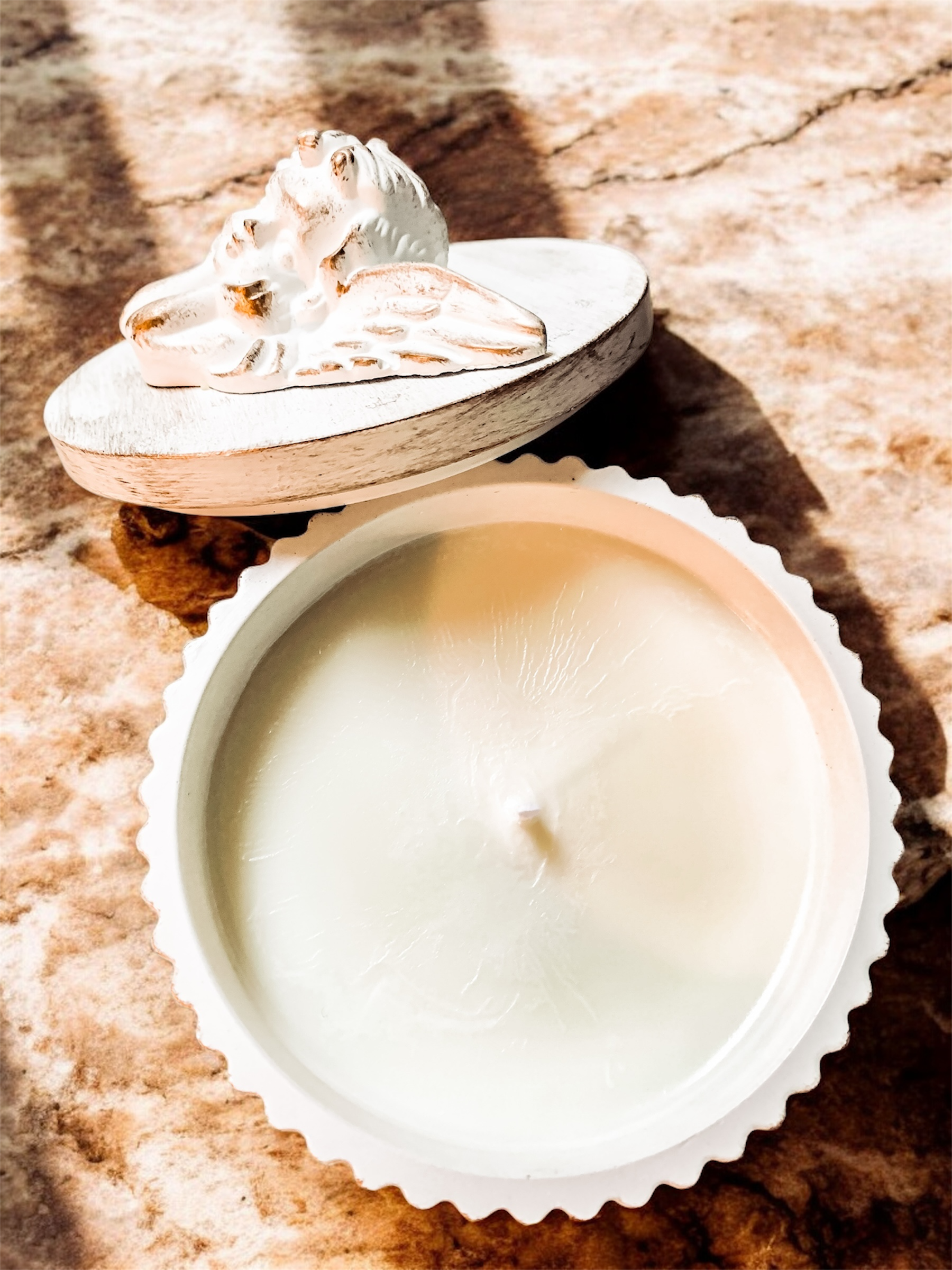 Wprowadź do swojego wnętrza nutę nostalgii i elegancji z naszą świecą sojową bezzapachową w stylu vintage. Zamknięta w wyjątkowym, białym pojemniku, który został celowo postarzany złotym kolorem, ta świeca emanuje klasycznym urokiem i subtelną harmonią. Pojemnik z delikatnym, złoconym wykończeniem stanowi doskonałą ozdobę, a na jego pokrywce znajduje się uroczy aniołek, który wprowadza spokój i magiczną atmosferę.
