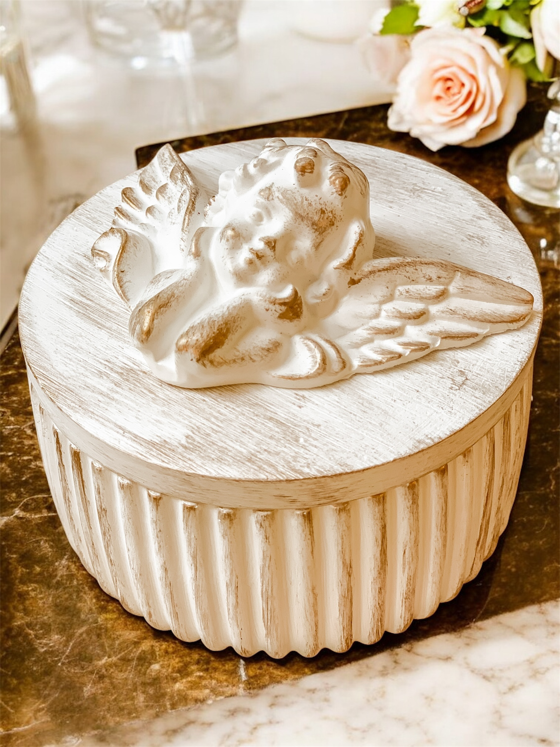 Design Vintage: Połączenie matowej bieli z ręcznymi przecieraniami w kolorze złota nadaje każdemu egzemplarzowi unikalny charakter. Wieczko z figurką aniołka sprawia, że produkt pełni funkcję eleganckiej rzeźby.