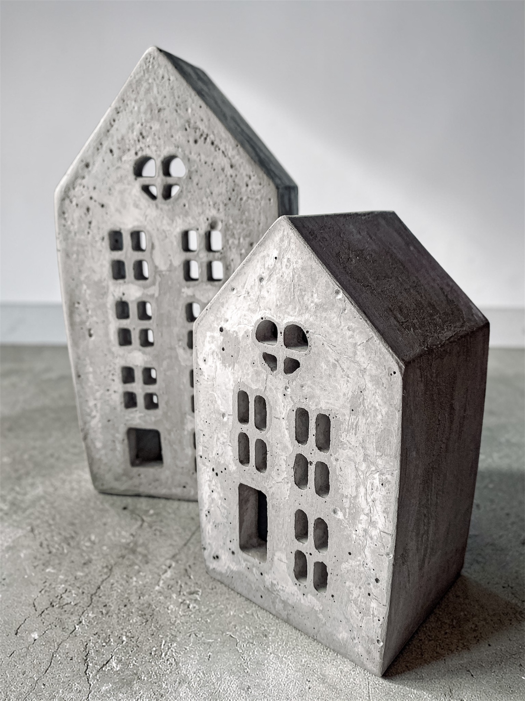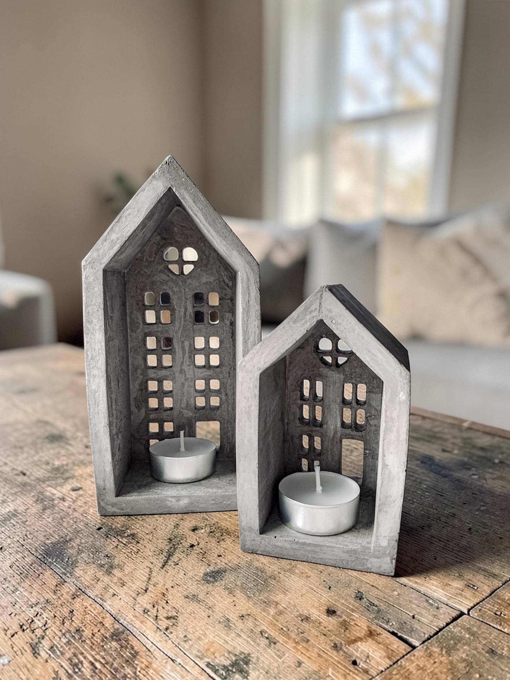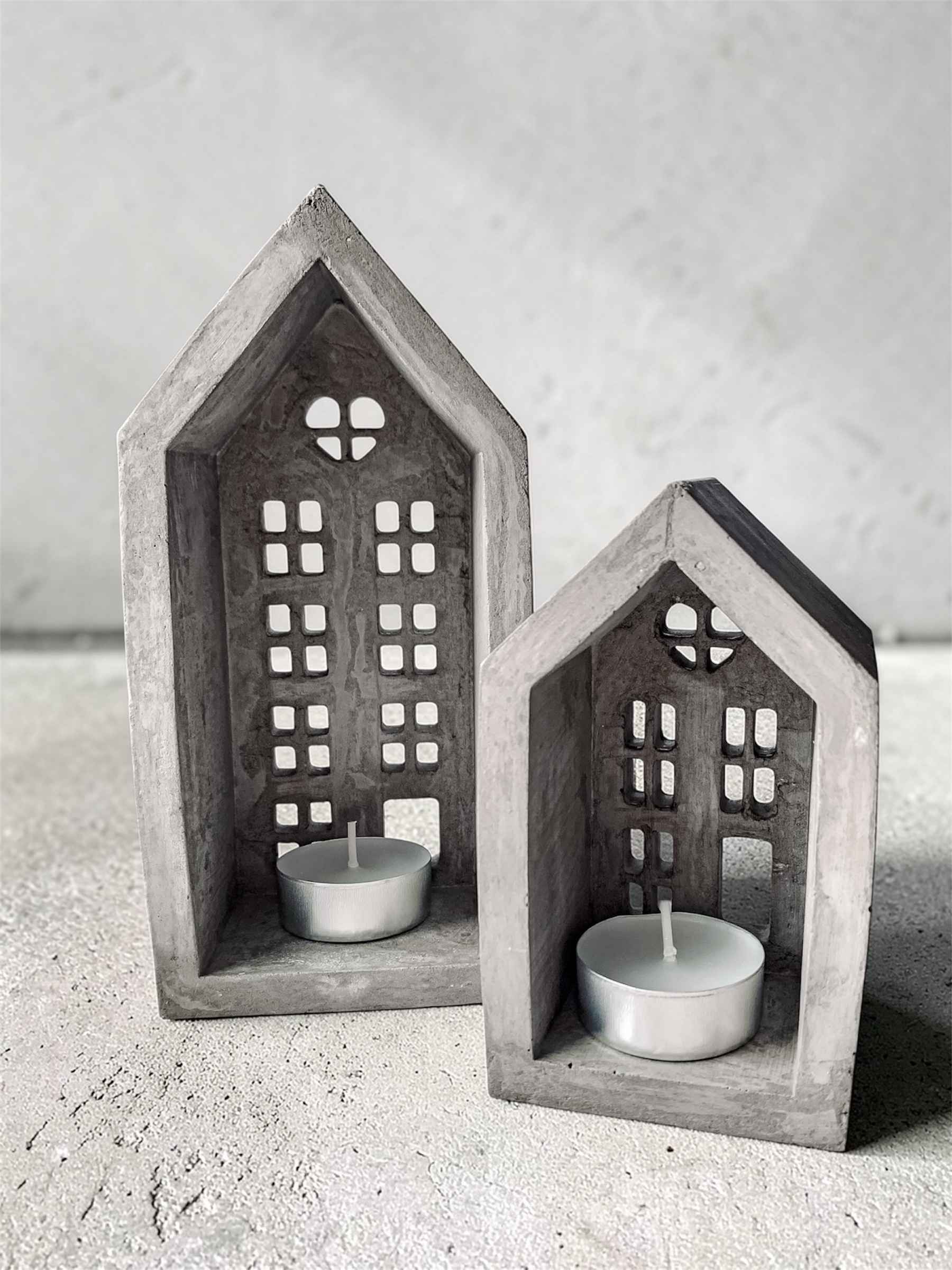 Zestaw betonowych lampionów na świeczki – mały i duży domek