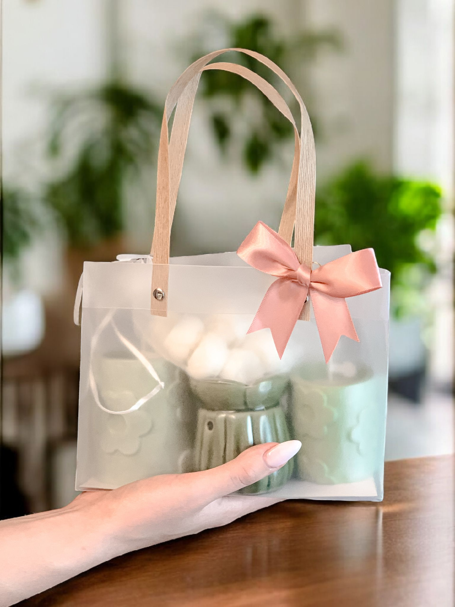 Całość zapakowana w elegancką torebkę prezentową z subtelną różową kokardką. Idealny wybór dla tych, którzy cenią minimalizm i naturalne akcenty w swoim otoczeniu.